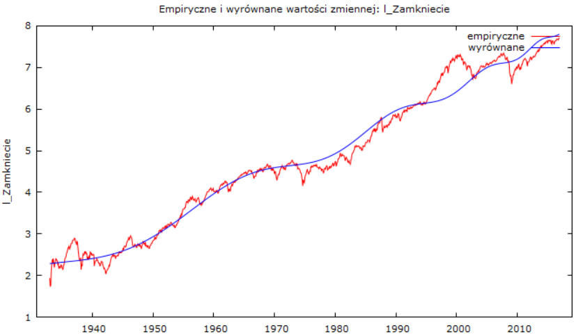 Jednakże obecnie możemy już dodać rok 2016. Pytanie czy wielkość tc zmieni się? Użyłem tych samych wstępnych parametrów. NMNK oszacował ponownie tc = 24,87, a wykres jest taki: